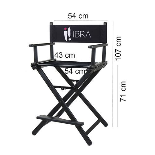 Ibra makeup artist chair. It was made of aluminum, thanks to which the construction is very solid and resistant to loads. They can be easily transported thanks to the folding option. The product is stable and light. The back and seat are made of waterproof fabric. It provides excellent durability and comfort while sitting. The frame has been enriched with a movable leg support. Easy to store and use. The product is perfect for beauty salons, on the set, as well as at home. The perfect solution for make-up artists working in the field. Easy to clean. Available in black shade.