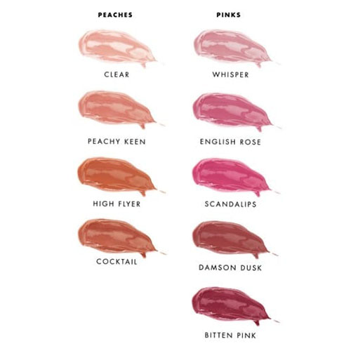| מרכיבים | HIGH FLYER : RICINUS COMMUNIS SEED OIL, OLEIC/LINOLEIC/LINOLENIC POLYGLYCERIDES, SORBITAN OLIVATE, CERA ALBA, SIMMONDSIA CHINENSIS SEED OIL, AROMA, COPERNICIA CERIFERA CERA, CANDELILLA CERA, TOCOPHEROL [+/- CI 77891 [TITANIUM DIOXIDE], CI77491 [IRON OXIDE)]. ———- PEACHY KEEN, DAMSON DUSK, CLEAR, WHISPER: RICINUS COMMUNIS SEED OIL, OLEIC/ LINOLEIC/ LINOLENIC POLYGLYCERIDES, SORBITAN OLIVATE, CERA ALBA, SIMMONDSIA CHINENSIS SEED OI, AROMA, COPERNICA CERIFERA CERA, CANDELILLA CERA, MICA, TOCOPHEROL [+/- CI77891 (TITANIUM DIOXIDE), CI 77491 (IRON OXIDE), CI 77742 (MANGANESE VIOLET), CI 77492 (IRON OXIDE), CI 77499 (IRON OXIDE)]. ———- SCANDALIPS, ENGLISH ROSE, BITTEN PINK, COCKTAIL: RICINUS COMMUNIS SEED OIL, OLEIC/LINOLEIC/LINOLENIC POLYGLYCERIDES, SORBITAN OLIVATE, CERA ALBA, SIMMONDSIA CHINENSIS SEED OIL, MICA, AROMA, COPERNICIA CARIFERA CERA, CANDELILLA CERA, TOCOPHEROL [+/- CI77891 (TITANIUM DIOXIDE), CI77491 (IRON OXIDE), CI77492 (IRON OXIDE), CI 75470 (CARMINE), CI 77742 (MANGANESE VIOLET)]. |