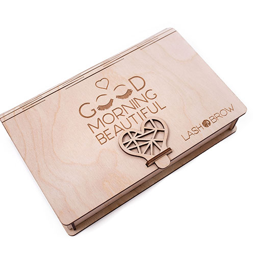 Brand gift set LashBrow. It is placed in a unique box / casket, made of real wood and closed with a charming heart-shaped padlock. It contains 3 iconic LashBrow cosmetics for the care and make-up of eyelashes and eyebrows, such as: a set of eyelashes in a bottle, a 3D massacre and RegeneOil eyelash and eyebrow oil. With their help, eyelashes become visually immediately extended, thickened and nourished, as well as underlined with an intense shade of black. At the same time, the oil rebuilds and regenerates. An elegant box with embossed patterns is perfect for storing cosmetics or other small items. The set is perfect as a gift for a loved one.