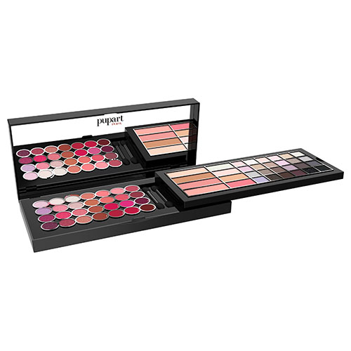 PUPART L – SMOKEY SHADES by PUPA. Set of cosmetics for face, eye and face makeup. It consists of: 2 compact blushes, powder, bronzer, 3 highlighting powders, 3 concealers, eye shadow primer, 20 eye shadows, 2 double applicators, as well as 16 lip glosses and 12 cream lipsticks. The colors will allow you to create makeup for any occasion. The packaging in shades of black, white and gold looks very elegant. A mirror was placed under the closing cover. The product will be a great gift idea for any lover of makeup.